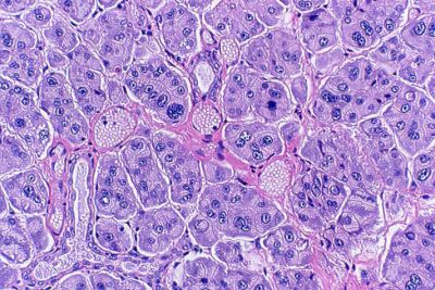 This is a histology gland of salivary gland. H&E; 20X magnification.