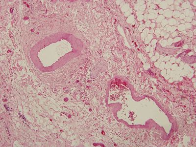 This histology slide is from the tissue surrounding the gallbladder. Blood vessels are visible. 100X; H&E stain.