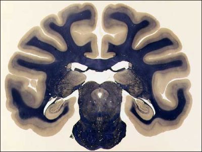 This is a 40 micron Rhesus monkey section stained with Weil-Myelin stain.