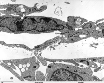 Transmission electron microscope image of a thin section cut through the developing brain tissue (telencephalic hemisphere) of an 11.5 day mouse embryo. This image shows the telencephalon surface just before perforation by a capillary. Before perforation occurs, the vascular and cerebral basal laminae are in contact and will become fused at the point of perforation by the the capillary filopodia. JEOL 100CX TEM