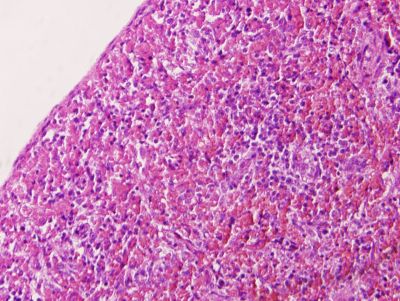 This histology slide is from the spleen. H&E stain; 400X total magnification.